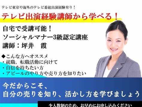 ソーシャルマナー3級認定講座 講師:坪井 霞 1月10日(土)【ZOOM】日程相談承ります。